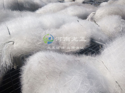 立體彈性填料篩選了聚烯烴類和聚酰胺中的幾種耐腐、耐溫、耐老化的品種,混合以親水、吸附、抗熱氧等助劑,采用特殊的拉絲,絲條制毛工藝,將絲條穿插固著在耐腐、高強度的中心繩上,由于選材和工藝配方精良,剛柔適度,使絲條呈立體均勻排列輻射狀態,制成了懸掛式立體彈性填料的單體,彈性填料在有效區域內能立體全方位均勻舒展滿布,使氣、水、生物膜得到充分混滲接觸交換,生物膜不僅能均勻的著床在每一根絲條上,保持良好的活性和空隙可變性,而且能在運行過程中獲得愈來愈大的比表面積,又能進行良好的新陳代謝。